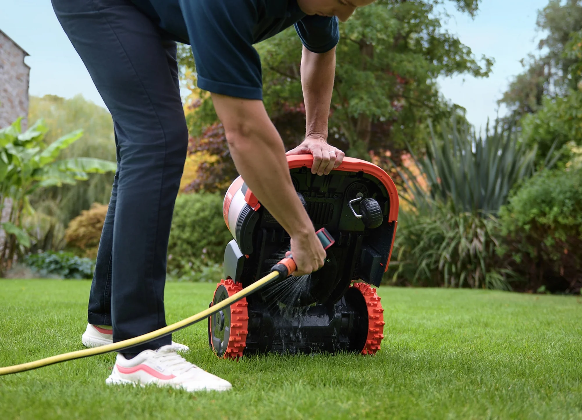 Zaradi te visoke stopnje zaščite lahko kosilnico Navimow H brez skrbi čistite z vrtno cevjo. Vodoodporna zasnova poskrbi, da je kosilnica zaščitena tako med čiščenjem kot tudi med delovanjem v vlažnih razmerah.